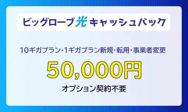 | ビッグローブ光10ギガ | 30,000円増額でキャッシュバック合計50,000円 |