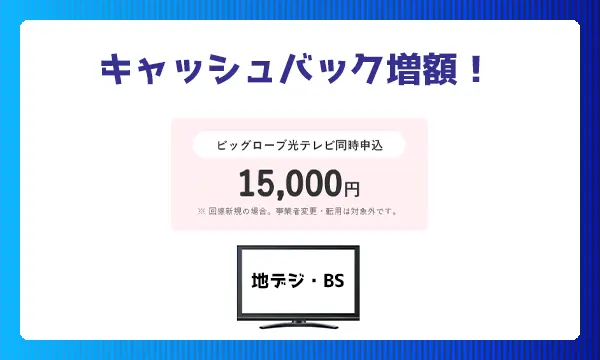 | キャンペーン条件 | ビッグローブ光の申し込みと同時に「ビッグローブ光テレビ」または「トータルネットセキュリティ」に申し込むこと |