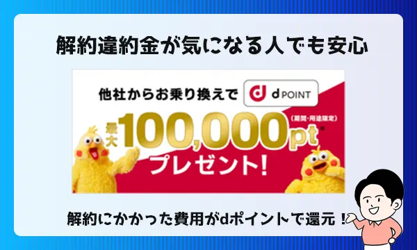 すでに他の光回線を利用している人で解約する際に解約金がかかる場合、解約にかかった費用相当額のdポイントが最大100,000ptもらえます。