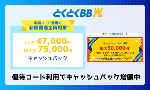 当サイト限定優待コード「XQVT」利用で1ギガ47,000円キャッシュバック!10ギガは75,000円キャッシュバック!