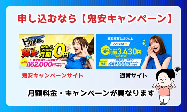 しかし、GMOとくとくBB光は通常の申し込み窓口の他に、キャンペーンや月額料金が異なる鬼安キャンペーンのページが用意されています。