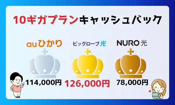 クーポンの利用で1ギガプランが83,000円、10ギガプランで最大126,000円キャッシュバックが増額となります。